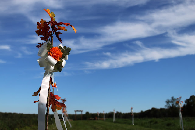 All in all, it was a gorgeous and meaningful day... The ceremony was held in a clover field that our late father had lived and farmed on his entire life... And the weather was perfect, which I have a feeling Dad helped with :) Angie & Chris's vows were exchanged under a wooden trellis handmade by our uncle... guests sat on hay bales covered with handmade quilts, and each of the decorations were made by family & friends. The day could not have been more special...